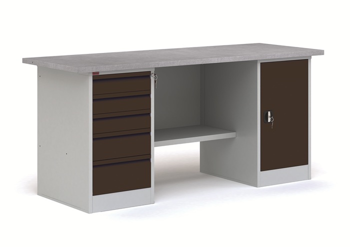 Металлические слесарный верстак ВП-4Т/1,6 черный представляет собой рабочий стол для ручной обработки металлических, деревянных изделий, а также предметов, выполненных из других материалов. Металлический верстак используется в мастерских, гаражах, автосервисах и в других рабочих зонах. Он являются основой, как небольшого промышленного производства, так и крупного предприятия. Допустимая равномерно распределенная нагрузка на верстак - 1000 кг, на полку верстачную - 40 кг, на выдвижной ящик и полку тумбы - 30 кг. В комплект верстака ВП-4Т/1,6 черный входит: столешница СТ-1,6 из МДФ, покрытая оцинкованным листовым металлом, комплект К-3/1,6 (стенка задняя металлическая), тумба Т-2Т с пятью выдвижными ящиками на телескопических направляющих, тумба Т-1 с двумя съемными полками. Тумбы закрываются ключевым замком. Дополнительно на верстак можно установить два перфорированных экрана соответствующего размера, аксессуары на экран. Цвет: верстак - серый Ral 7035, дверь тумбы - черный муар Ral 7021. Гарантия 1 год. Срок службы 10 лет