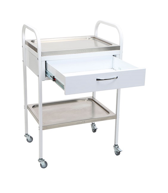 Столик медицинский манипуляционный HILFE MD SМ-1 предназначен для размещения инструментов, лекарственных препаратов, приборов. Соответствуют требованиям нормативных документов ГОСТ Р 50444-92, ГОСТ Р 16371-2014. Столик комплектуется выдвижным ящиком, 2 полками, 4 резиновыми колесами, два из которых снабжены стопорами. Диаметр колес 50 мм. Каркас изготовлен из профильной трубы квадратного сечения 20х20х1,5 мм, покрытый эпоксидно-порошковой краской. Полки изготовлены из нержавеющей стали толщиной 1 мм, методом "прессовой вытяжки". Телескопические направляющие обеспечивают свободный и плавный ход ящиков даже при полной выгрузке, позволяют выдвигать ящик на всю длину использовать 100 процентов пространства. Максимальная нагрузка на выдвижной ящик и полки 15 кг. Поверхность столика HILFE MD SМ-1 new устойчива к ударам, сколам, средствам дезинфекционной обработки. Цвет: белый Ral 9016, полка столика не окрашена. Поставляется в разобранном виде